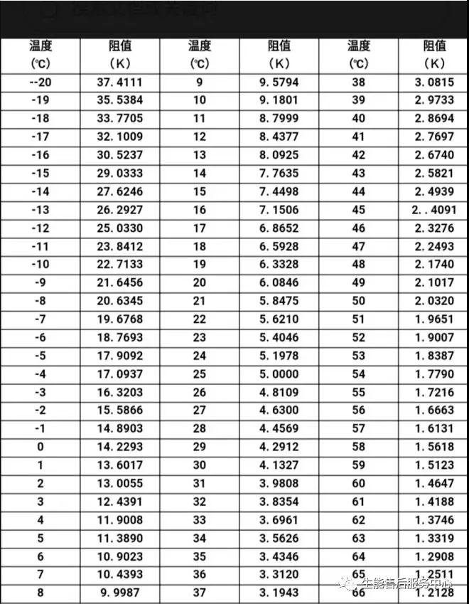 1.2使用万用表测量排气温度传感器,电阻是否正常,如有偏差则更换传感器电阻对照表下图。
